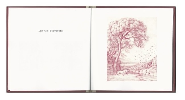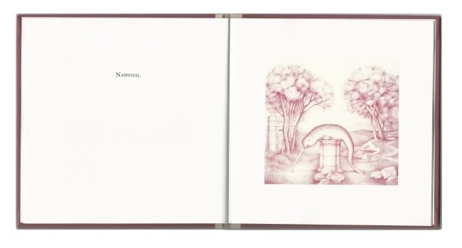 Newly paired and mystified inhabitants are set against idyllic, pastoral landscapes – a whale hangs from a tree, waiting for his weight to break the branch; elsewhere, a horse, awkwardly struggles escape from an inflated pufferfish; savage peacocks are tearing apart an octopus; and a baby elephant struggles to carry a beached whale back to the water.